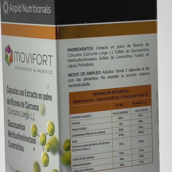 Movifort® es un suplemento alimenticio, que contiene Extracto en polvo de Rizoma de Cúrcuma (Cúrcuma Longa L), Glucosamina, Metilsufonilmetano y Condroitina.